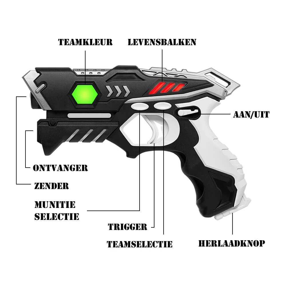 Deze lasergame set bestaat uit 2 KidsTag lasergame pistolen plus 1 lasergame projector.